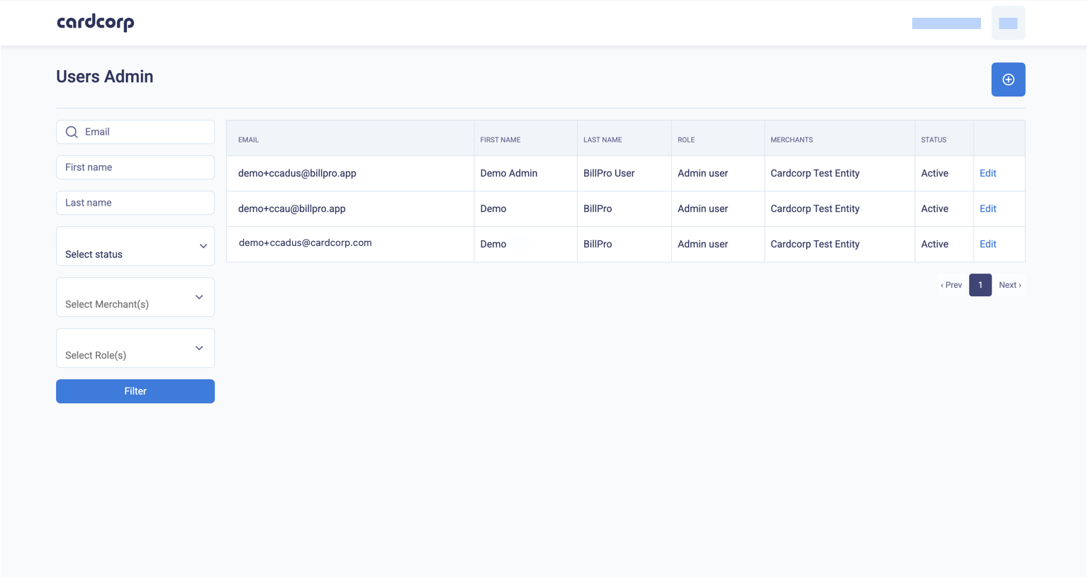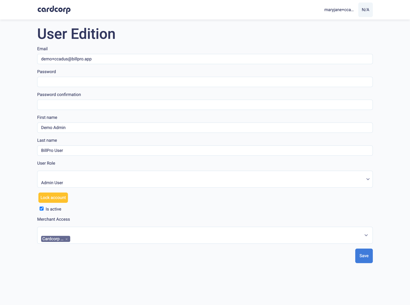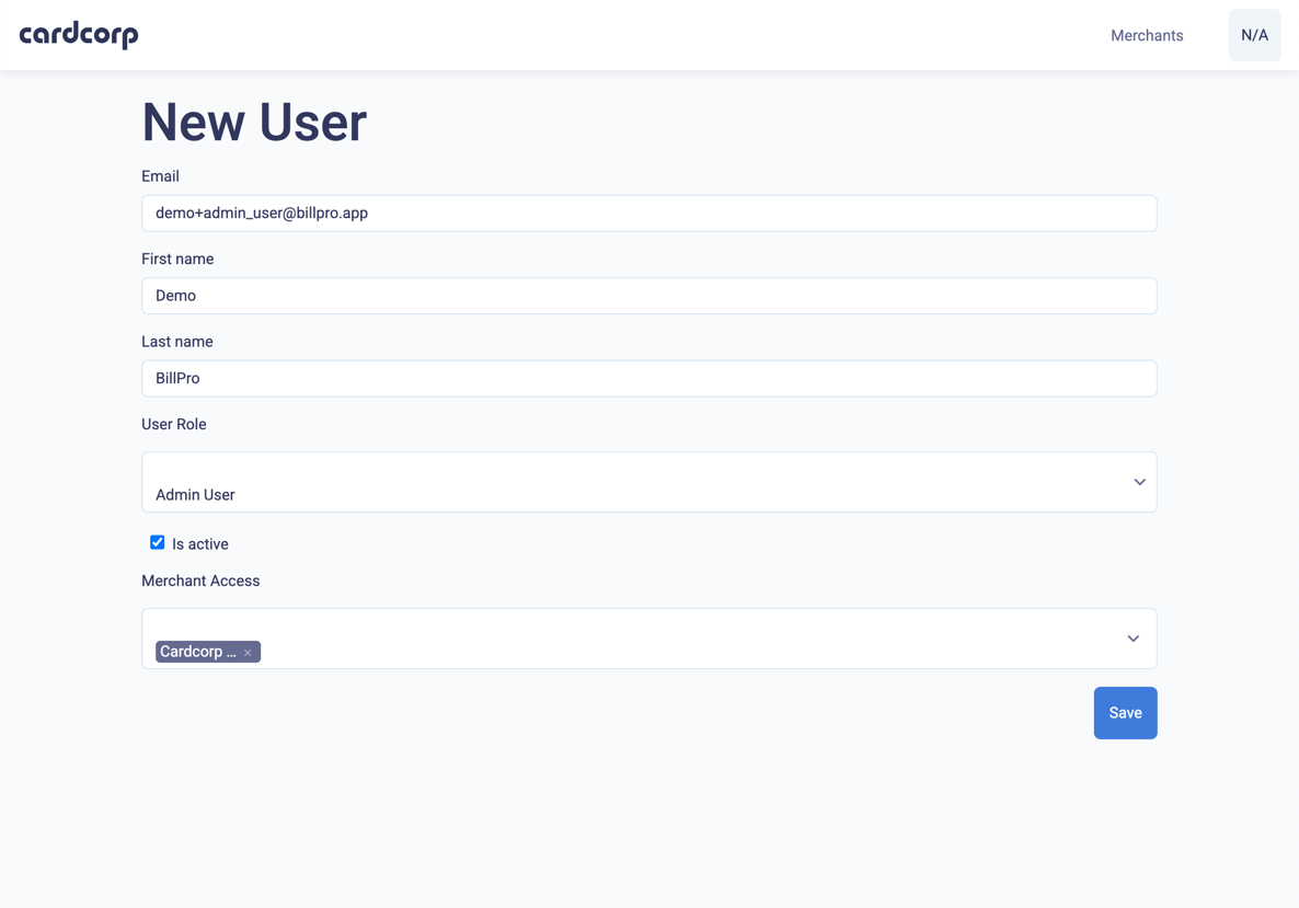 The CardCorp Merchant Hub will send the new user an email to set their password.