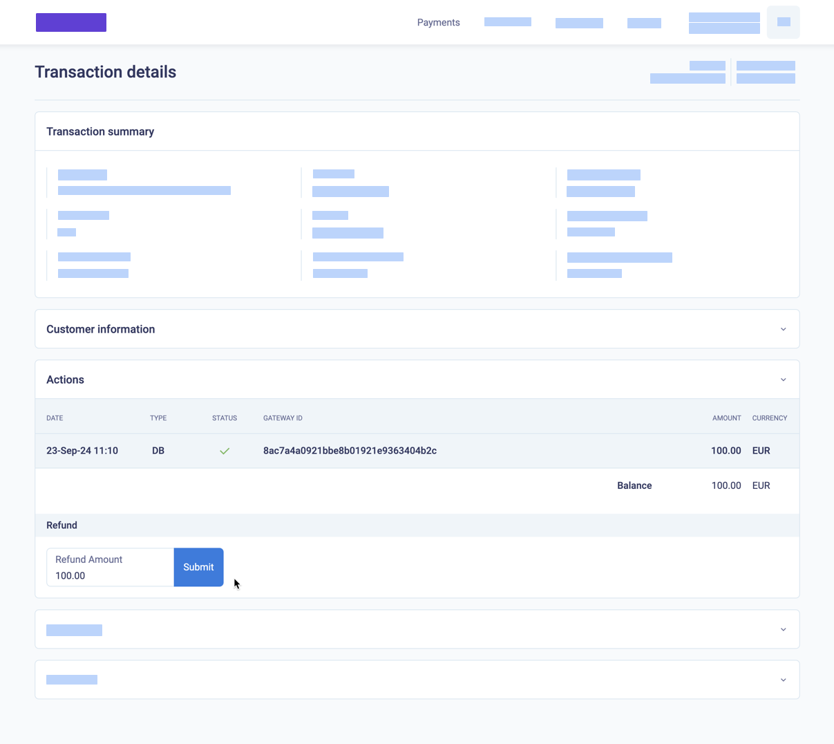 After successfully refunding an amount, the merchant hub deactivates the Refund button.