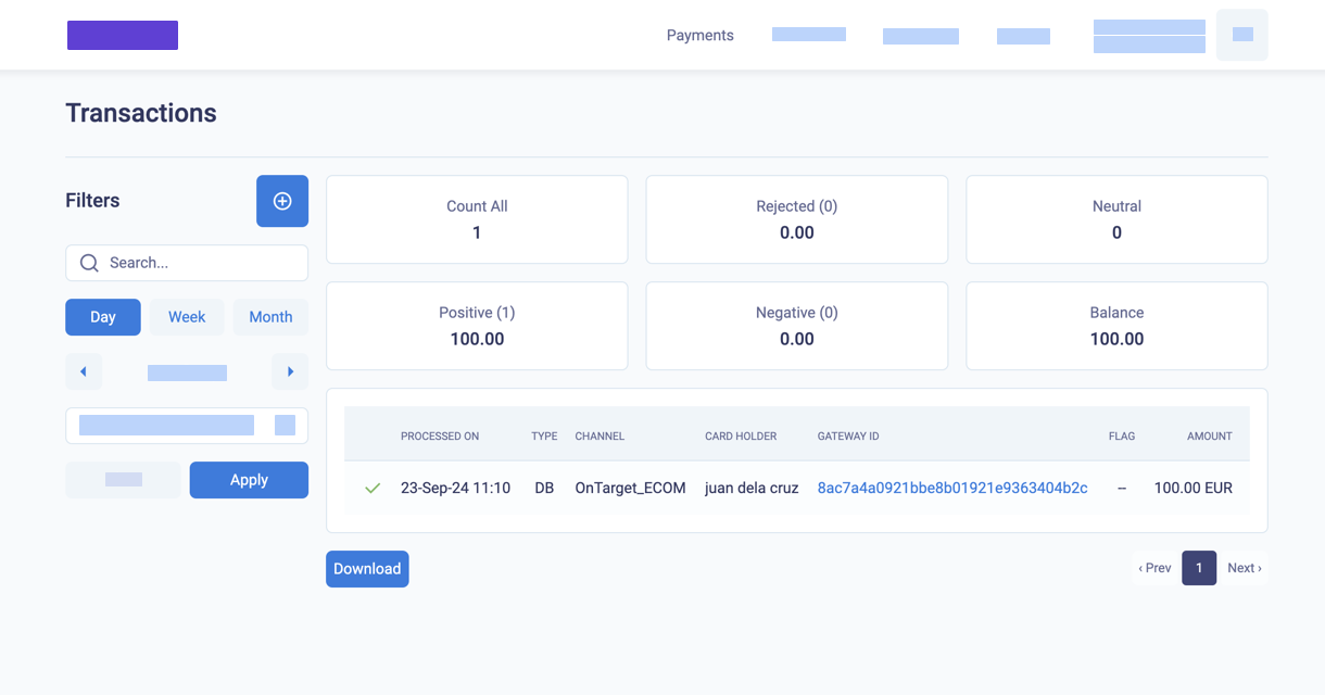 In the navigation menu, go to Payments. The Transactions list displays. If necessary, filter the list to find your transaction. See Payments